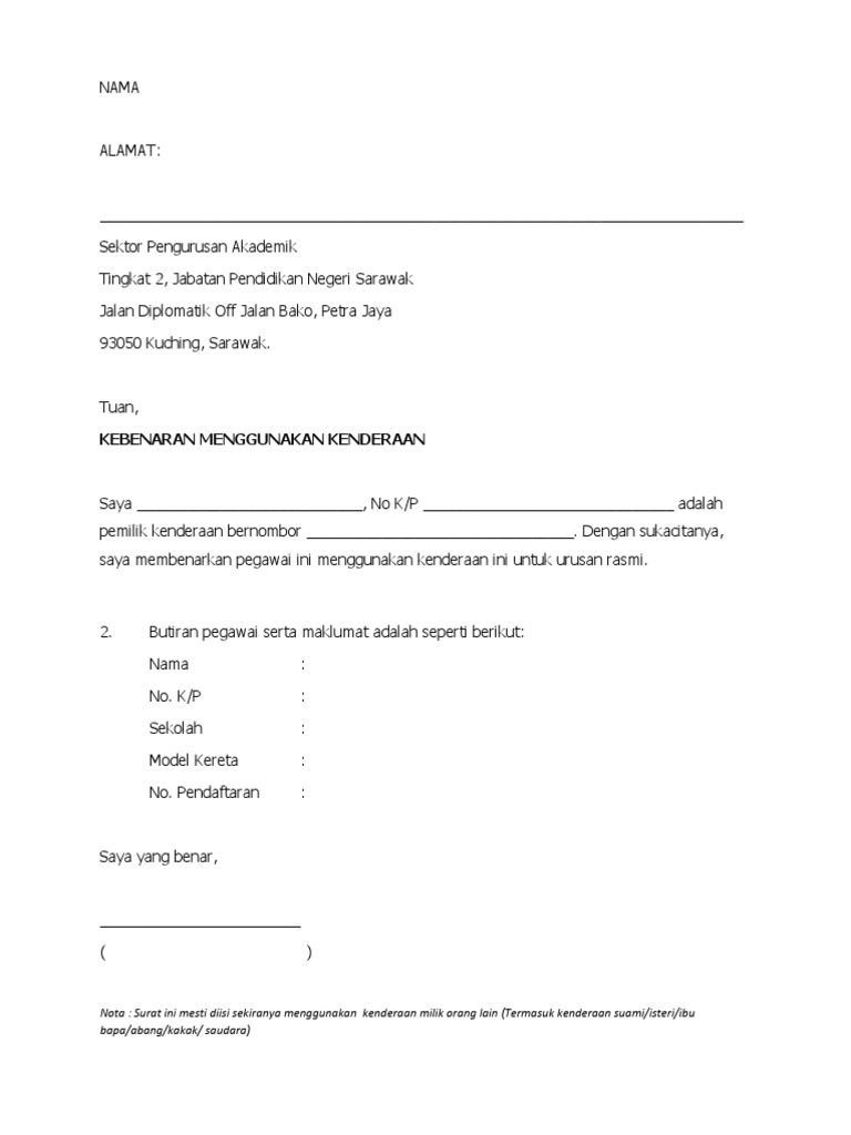 Tuan/puan, surat kebenaran menggunakan ruang pejabat. Surat rasmi kebenaran menggunakan kenderaan rasmi ru. Surat rekomendasi adalah suatu surat yang dibuat oleh pimpinan yang berisi tentang selanjutnya, surat rekomendasi digunakan oleh para pemegang untuk tujuan suatu hal agar mempermudah. Demikian surat perjanjian ini dibuat untuk dapat digunakan sebagaimana mestinya dan berlaku sejak tanggal ditandatanganinya. Jika belum menemui kesepakatan, maka akan diselesaikan secara hukum.