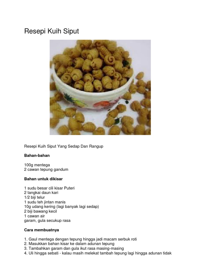 Resepi buah rotan sedap dan tips untuk rangupkan kuih ini. Biskut kacang mazola yang mudah step by step sukatan cawan. Resepi kuih siput rangup / malaysian crispy shell snack cara buat kuih siput homemade yang rangup dan sedap. 1 resepi bahulu 2 2 resepi batang buruk 3 3 resepi buah rotan 4 4 resepi cakar ayam 5 5 resepi kuih bangkit 6 6 resepi kuih karas 7 7 resepi kuih sepit 8 8 resepi kuih siput 9 9 resepi putu kacang 10 10 resepi tempeyek/rempeyek 11. Resipi kuih siput, kuih tradisional yang tidak asing lagi buat masyarakat melayu.