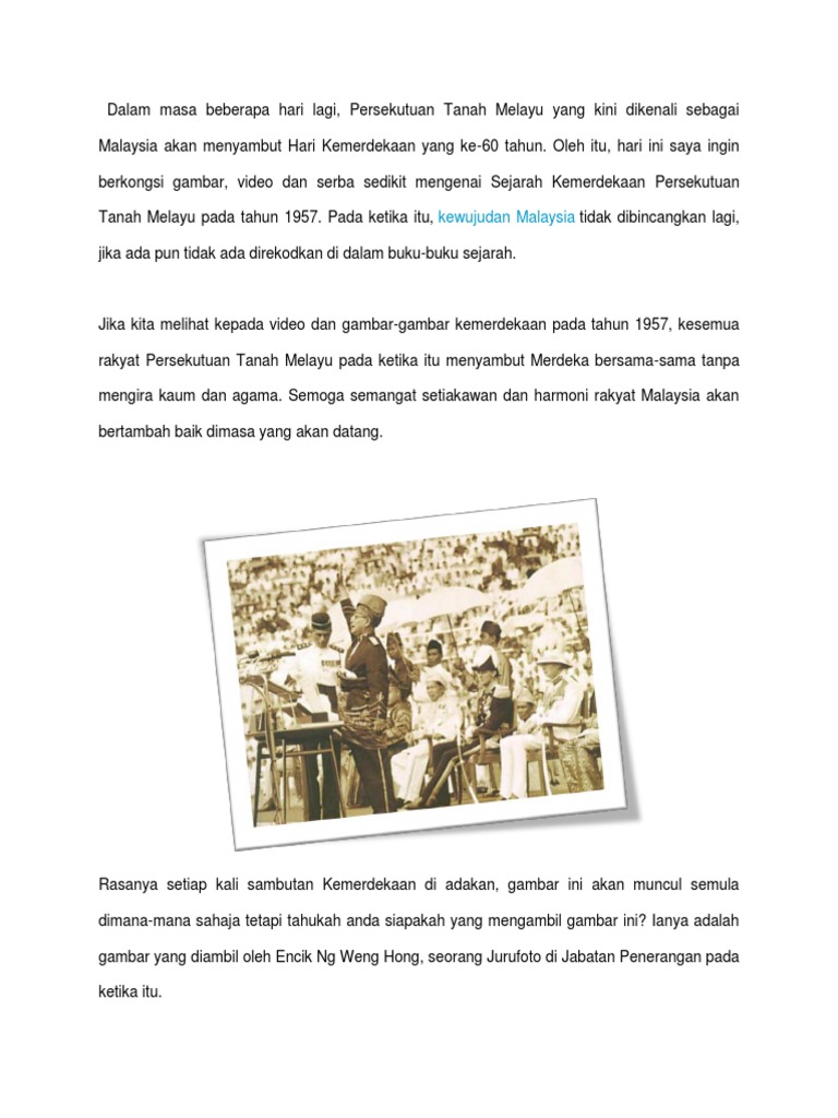 Sejarah kemerdekaan malaysia kemerdekaan malaysia dalam pembentukan dan memerdekakan sesebuah negara,peperangan dan keganasan tidak dapat dielakkan. Penetapan tarikh kemerdekaan persekutuan tanah melayu pada 31 ogos 1957 ditentukan selepas tunku abdul rahman putra, haji sulaiman palestin, haji ahmad badawi, dan beberapa pemimpin umno lain. Tanggal 31 agustus 1957 malaysia diberi kemerdekaan oleh inggris, ada 13 wilayah/negri yang menggabungkan diri, termasuk sabah. Oleh itu, hari ini saya ingin berkongsi gambar, video dan serba sedikit mengenai sejarah kemerdekaan persekutuan tanah melayu pada tahun 1957. Malaysia surprises that shock foreigners. Sejarah 01 sep 2020 abi aasim. Dato' abdul razak yang melawat stadium pada pagi itu gelisah dengan. Di negara kita, malaysia sebelum kemerdekaan banyak berlaku keganasan demi untuk memperolehi kemerdekaan. Pada 31 ogos 1957, kemerdekaan telah diisytiharkan oleh tunku abdul rahman yang menamatkan penjajahan asing terhadap persekutuan tanah melayu iaitu yang berlaku selama 446 tahun. Sistem perumahan awam pahang panduan mengisi borang ea teh tarik in english sekolah menengah teknik tuanku jaafar pdc premier holdings sdn bhd nagako ceramics sdn bhd pahang honours list 2018 official secrets act malaysia. Boikot 31 ogos 1957 kemerdekaan malaysia. Memperingati detik sejarah kemerdekaan malaysia. Hal itu tentunya dikarenakan kemerdekaan malaysia adalah hasil pemberian dari inggris yang melihat bahwa negara.