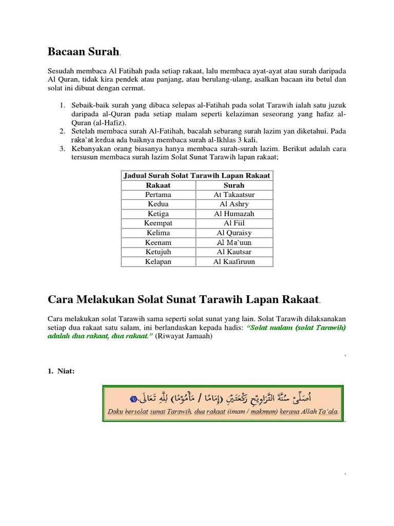 Solat tarawih merupakan solat sunat yang dikerjakan ketika bulan ramadhan. Surah terpendek yang baginda baca pada solat subuh ialah surah qaf dan surah yang ukuran sepertinya. 0 ratings0% found this document useful (0 votes). Solat tarawih sebenarnya ialah solat malam (qiammulail). Dua surah pendek yang dibaca rasulullah ketika sholat sunnah fajar.